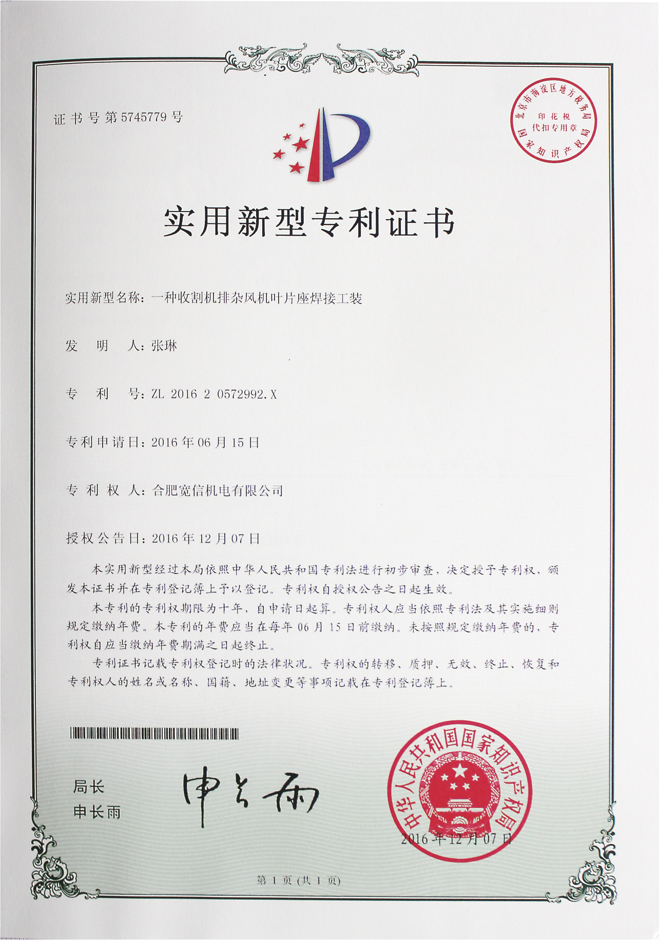 寬信實用新型證書